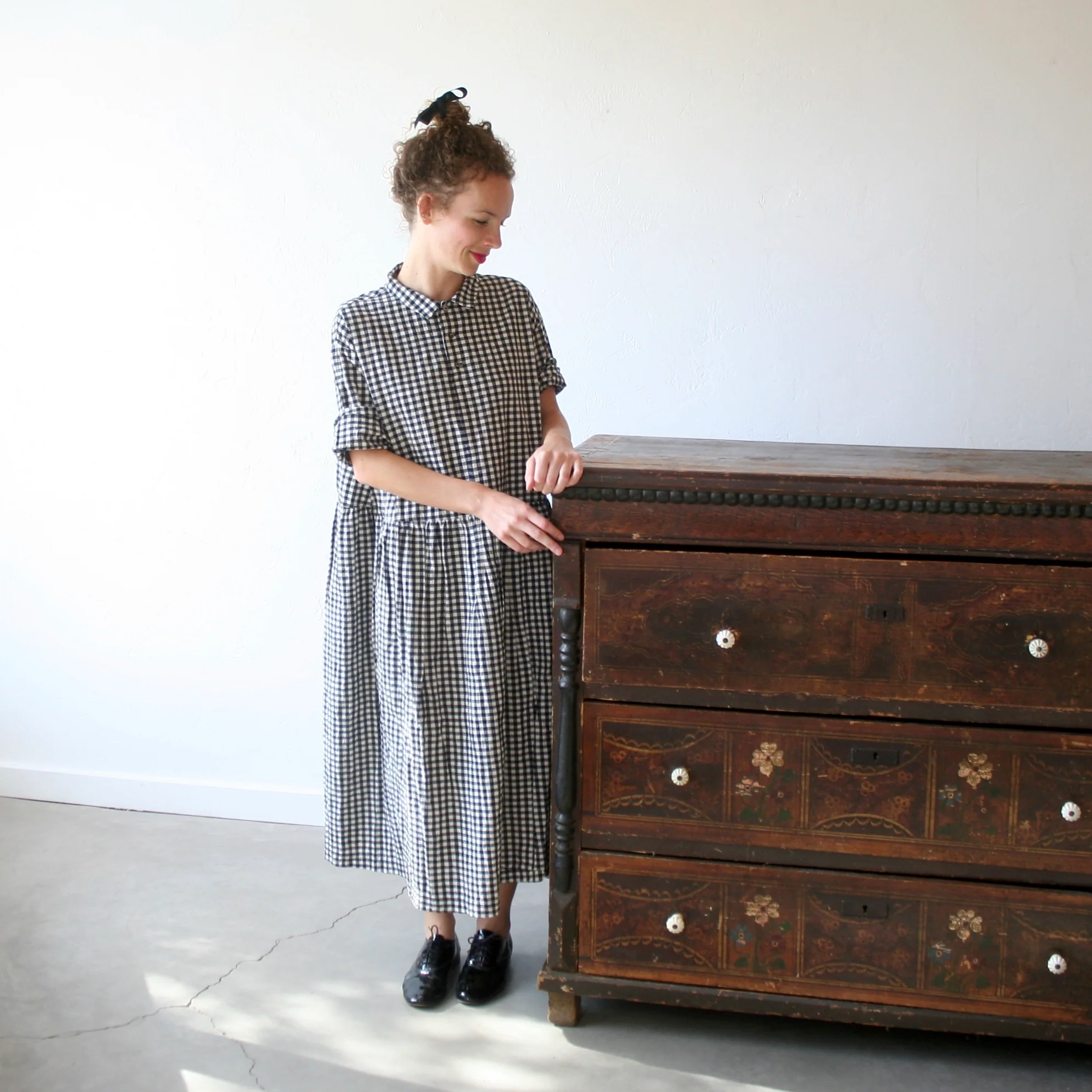 A wonderful gingham dress in a substantial weight cotton. This has a long length with gathering around the waist, pockets, a small collar and a two button closure down the front. It is easy to wear and can be dressed up or down. It would be wonderful layered with stockings or leggings and a warm coat in the colder months.