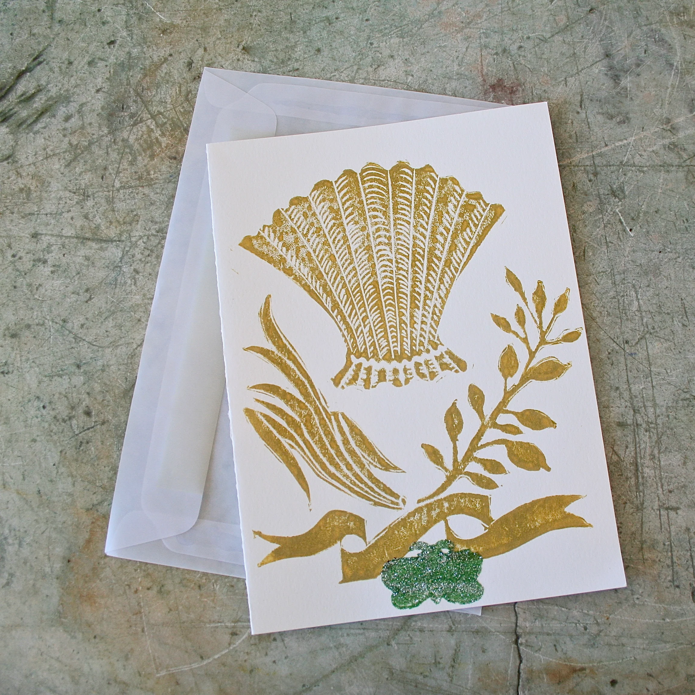 A fantastic handprinted card on artist grade paper. This one depicting a shell with leaves, ribbon and a glittered butterfly at the bottom. This comes with a vellum envelope.Ā